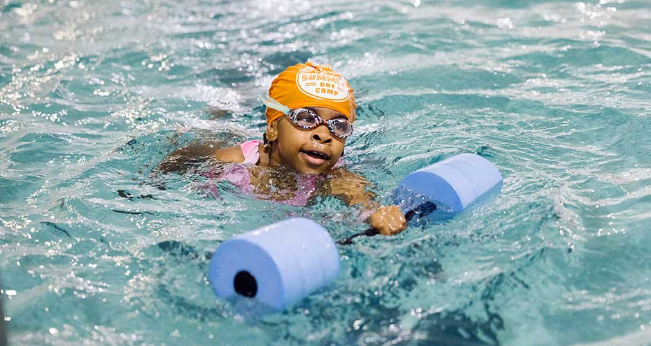 Campers are preliminarily tested and placed into appropriate swim groups. Our sessions include a “learn to swim” portion followed by organized recreational swim time. Campers must bring a towel, goggles, and a bag for wet bathing suits. Discovery and Explorers campers should arrive each morning in their bathing suits.